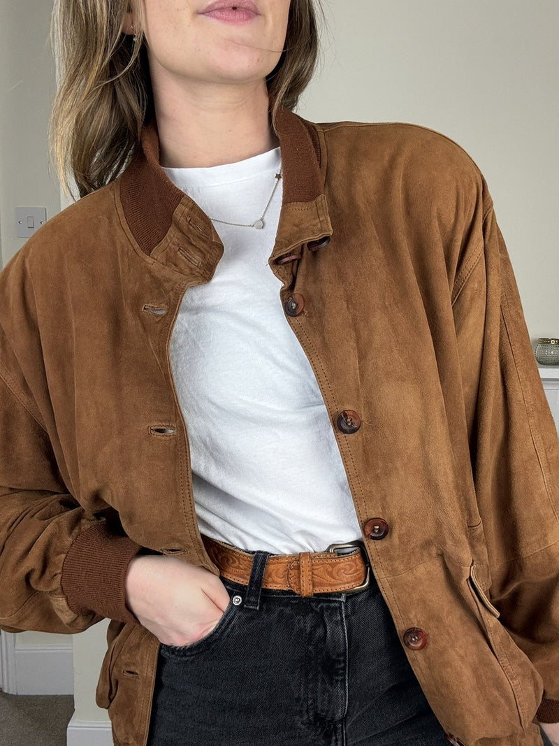 Vintage Size 2XL 16-20 Tan Brown Genuine Suede Leather Bomber Style Jacket