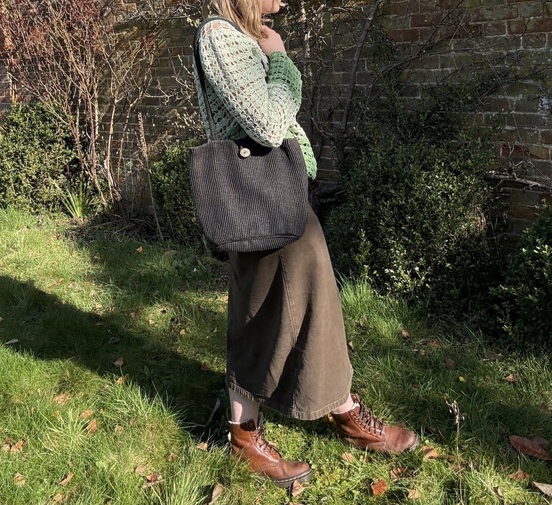 Vintage Black Boho Jute Shoulder Bag EAST