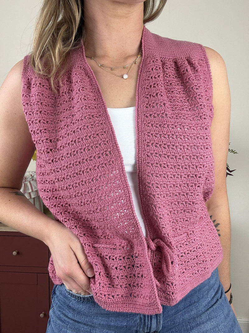 Vintage Size M 8-12 Pink Pointelle Tie Waist Knit Vest Waistcoat