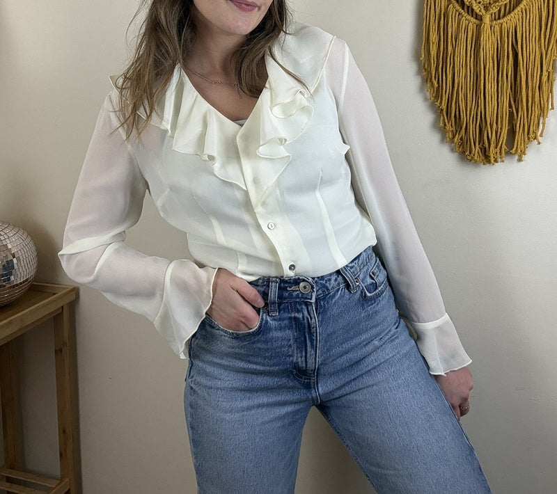 Vintage Size S 6-10 Cream Ruffle Neck Button Front Blouse BHS