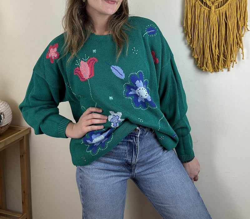 Vintage Size XXL 16-20 Teal Green Flower Embroidered Knit Jumper Tulchan