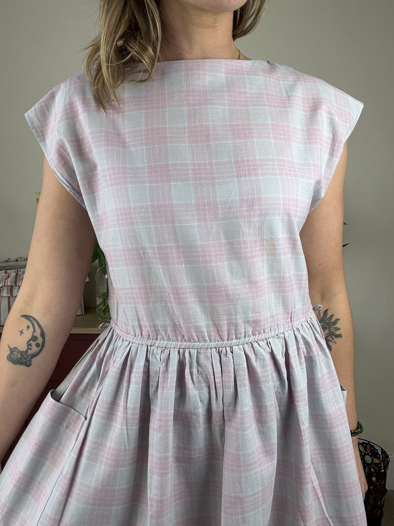 Vintage 70s Size M 10-12 Dusky Lilac Check Cotton Midi Dress