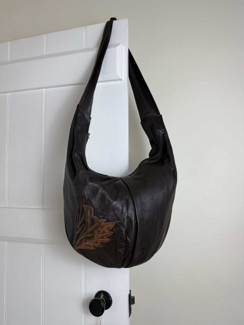 Vintage Dark Brown Genuine Leather Leaf Boho Sling Bag