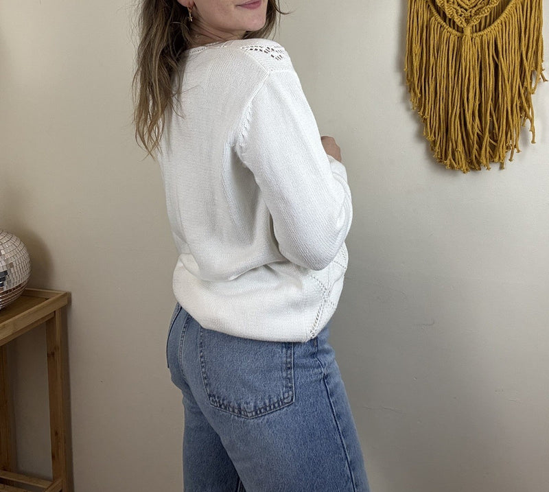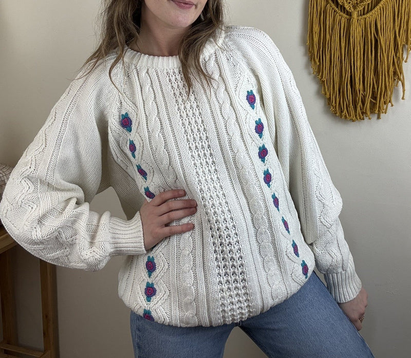 Vintage Size XL 12-16 White Flower Embroidered Cable Knit Jumper Michelle Simon