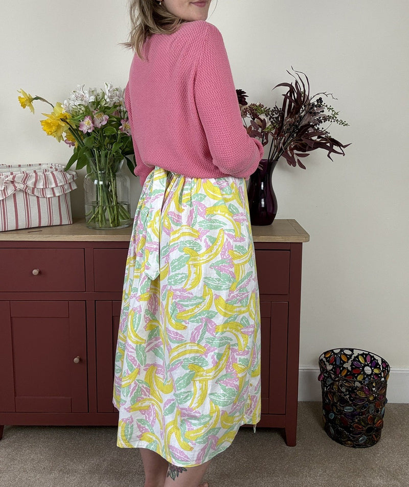 Vintage 70s Free Size 8-16 Pink Yellow Banana Cotton Wrap Midi Skirt