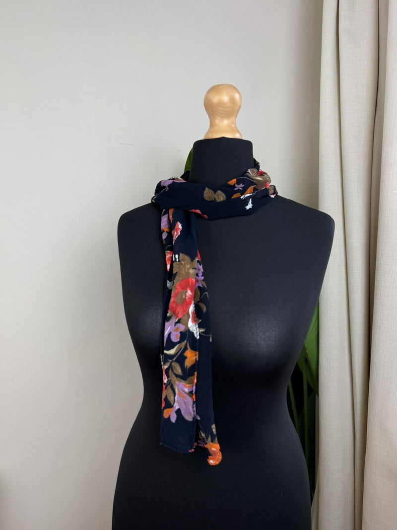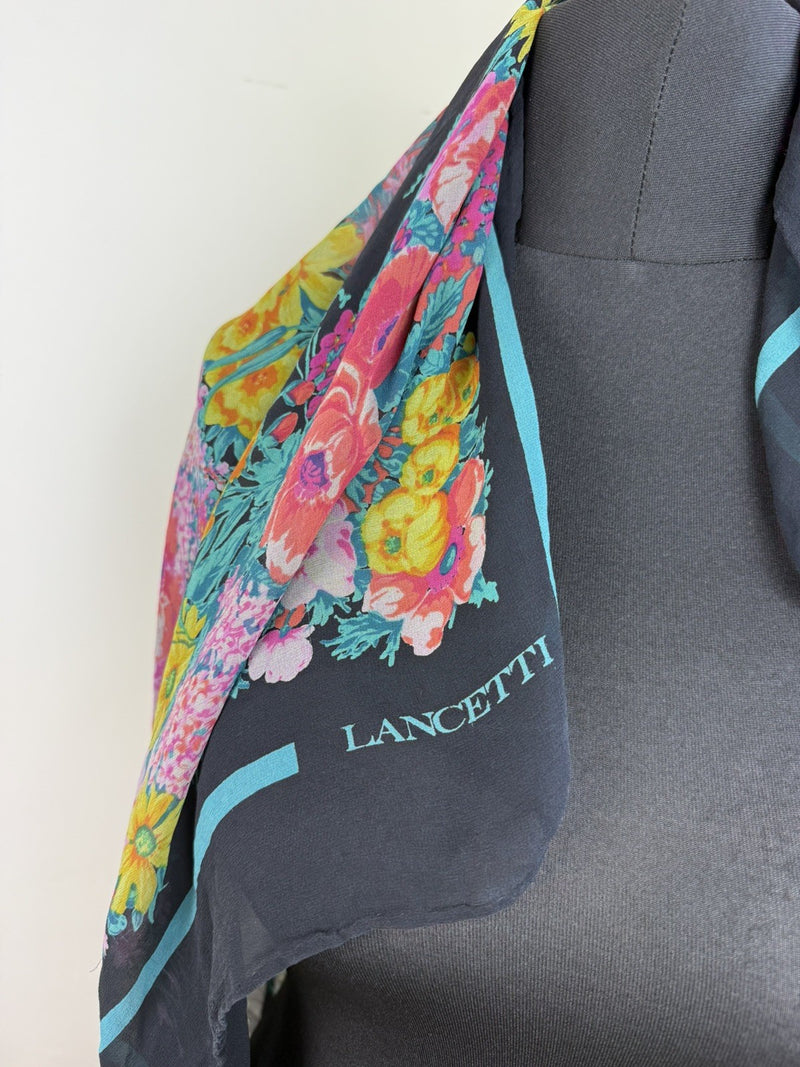 Vintage Dark Navy Black Contrast Floral Silk Scarf Neck Scarf Shawl Lancetti