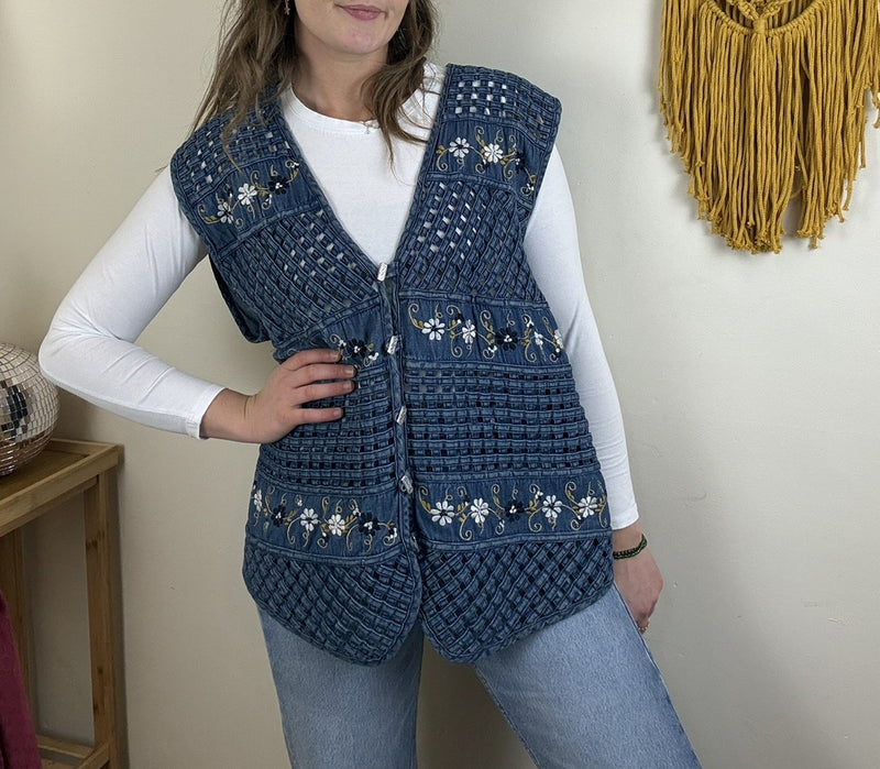 Vintage Size 2XL 16-20 Blue Flower Embroidered Denim Waistcoat