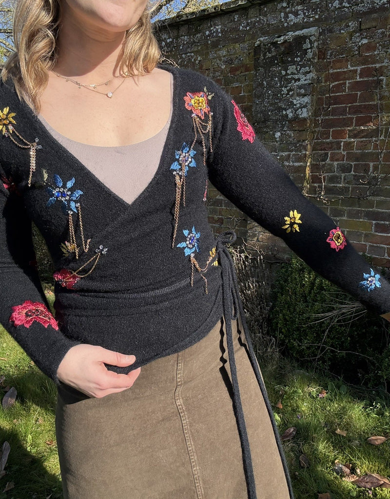 BNWT Vintage 90s Size S 6-10 Black Flower Embroidered Wrap Cardigan