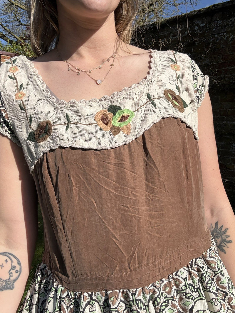 Vintage Size XL 14-16 Brown Pure Silk Boho Embroidered Dress Whistles