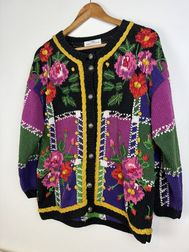 Vintage Size L 8-14 Black Chunky Cotton Knit Flower Cardigan St Michael