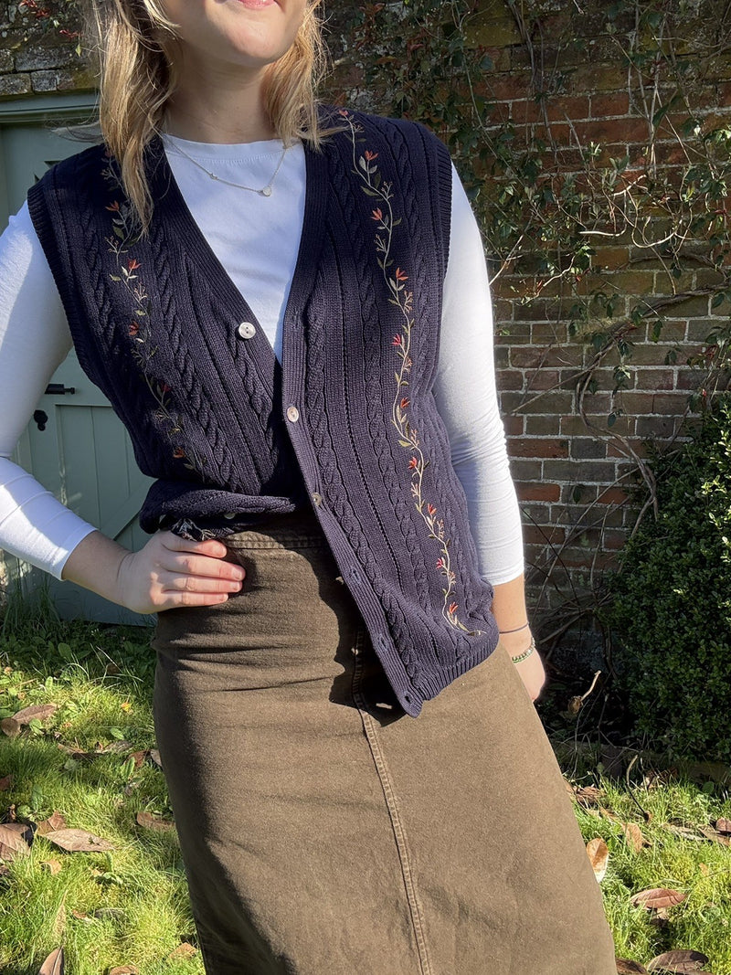 Vintage Size M 10-14 Navy Cottage Flower Embroidered Cotton Knit Vest Tulchan