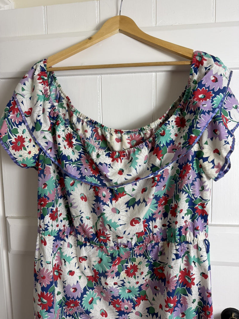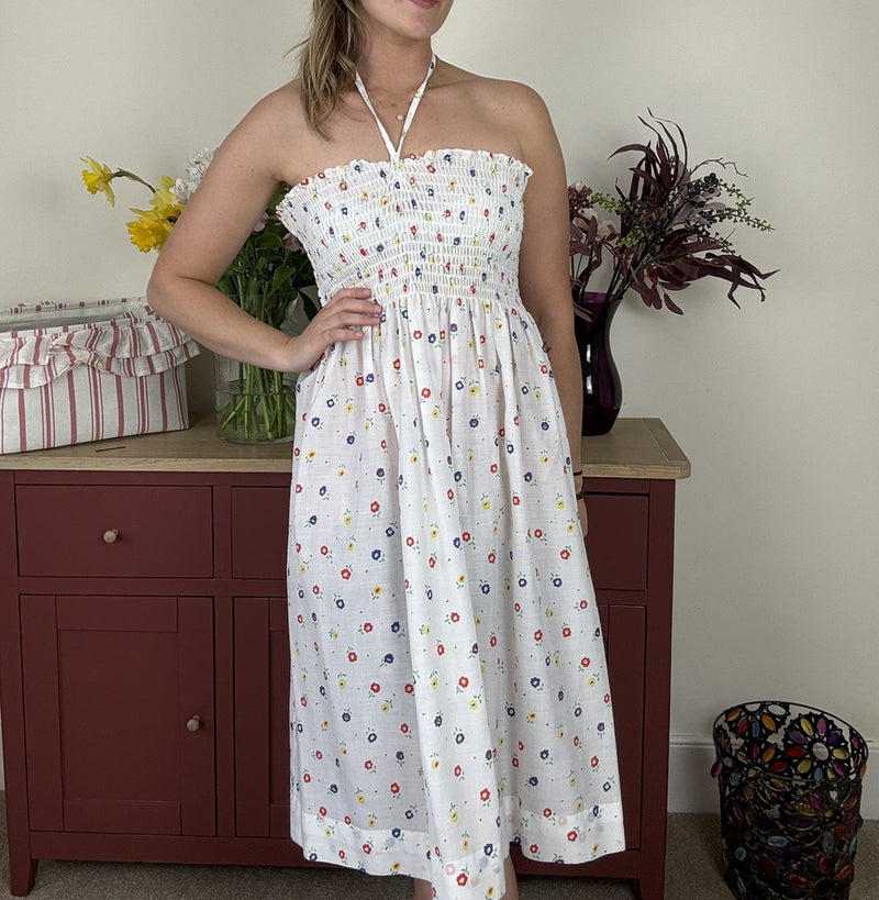 Vintage 1970s One Size 10-20 White Ditsy Floral Smocked Sun Summer Dress
