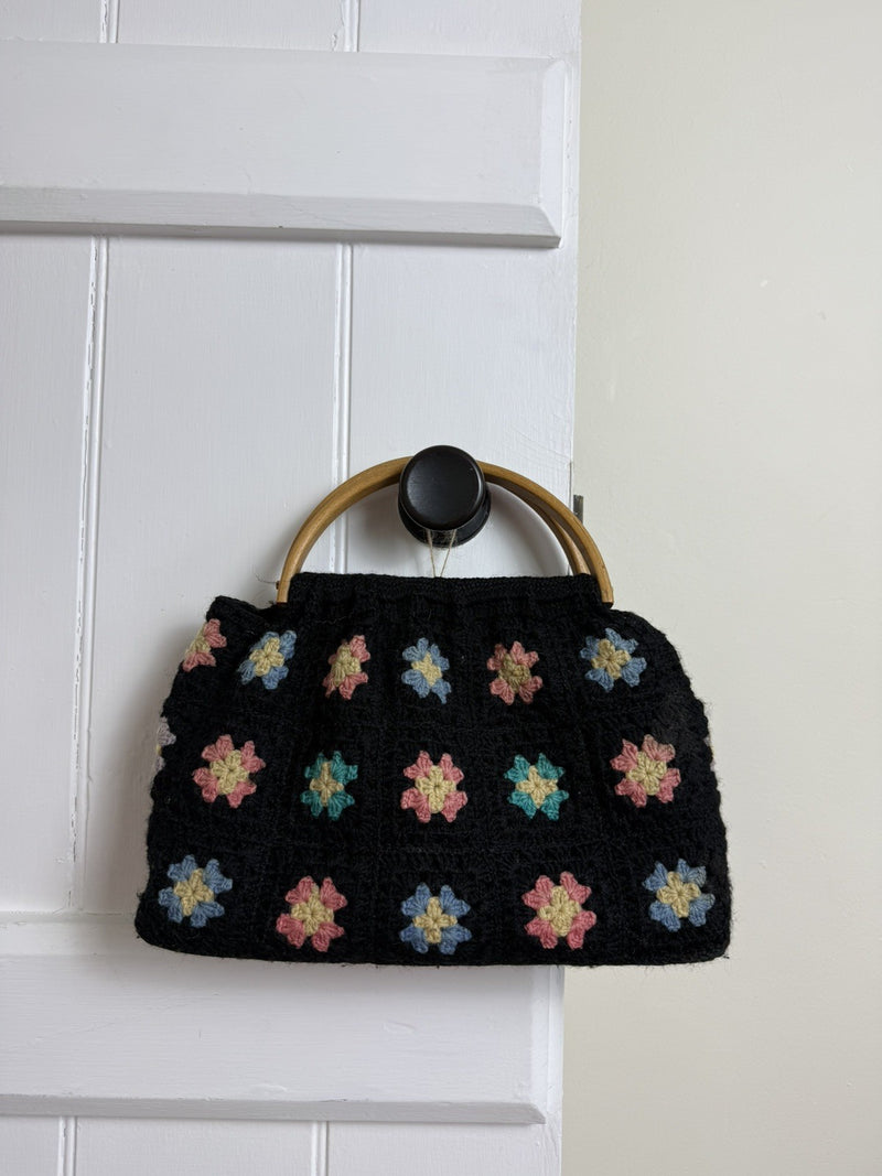 Vintage Black Flower Power Crochet Granny Square Knit Bag