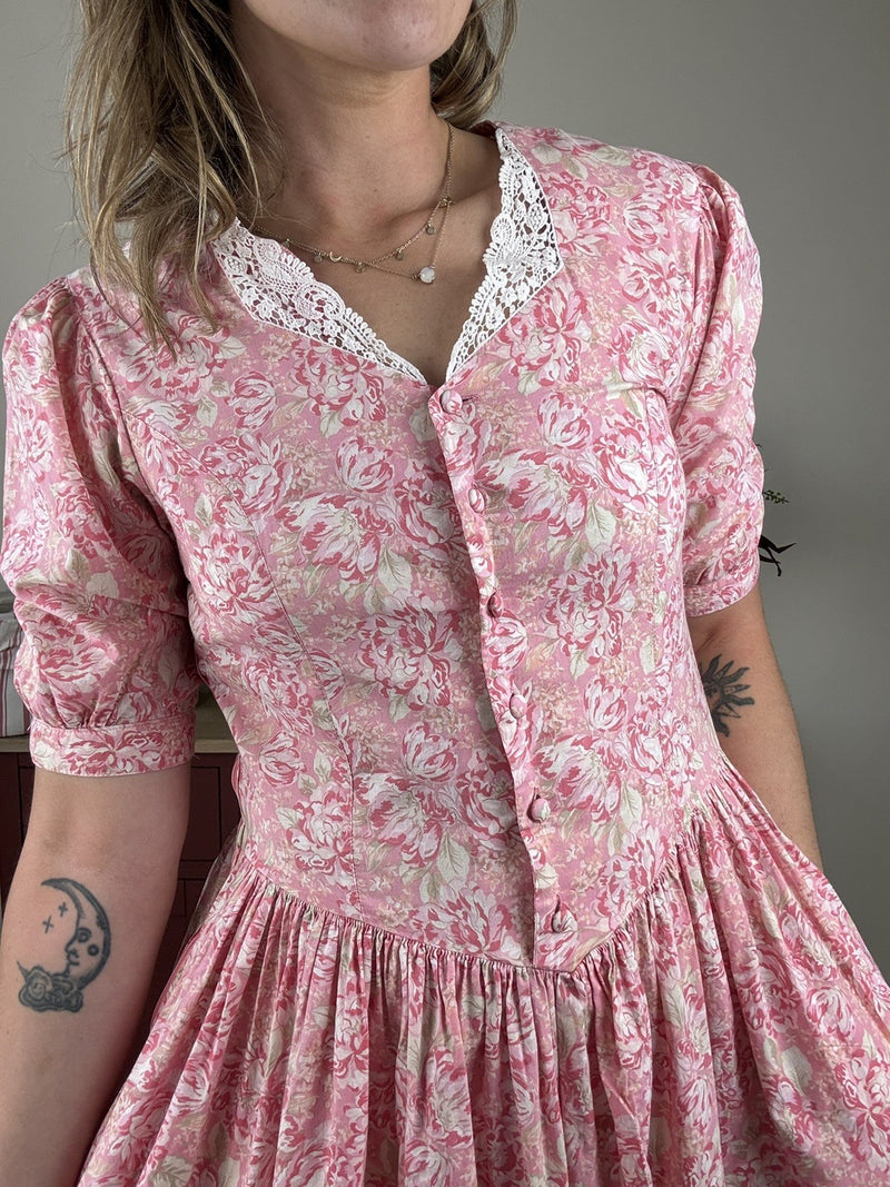Vintage Size XS 6-8 Pink Romantic Floral Cotton Laura Ashley Midi Prairie Dress