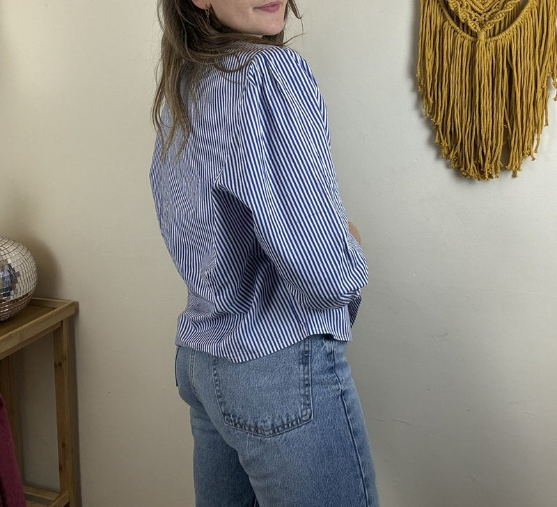 Vintage Size L 12-14 Blue Striped Cotton Lace Collar Blouse