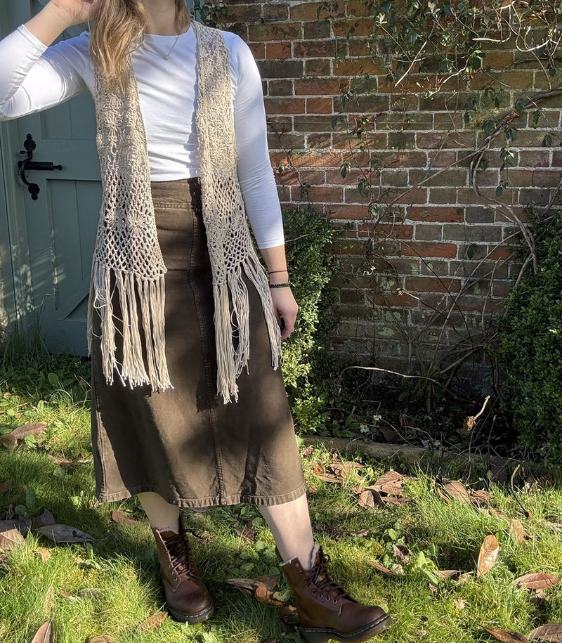 Free Size 6-18 Ecru Crochet Fringed Boho Knit Waistcoat