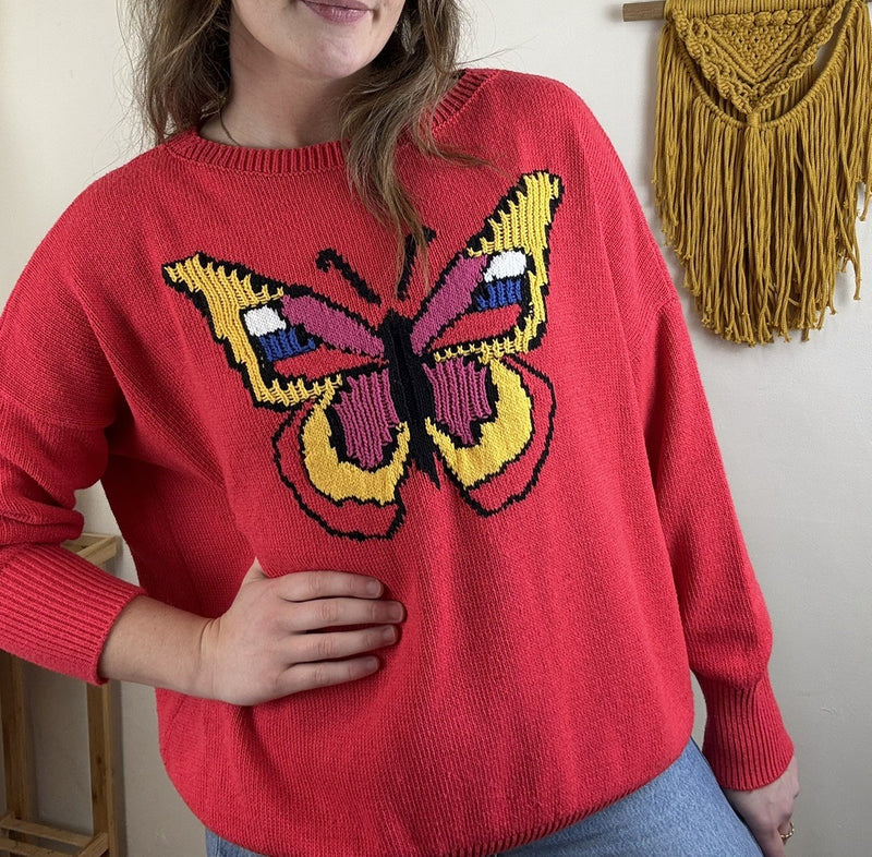 Size 2XL 14-22 Coral Red Butterfly Front Fine Knit Jumper Benetton