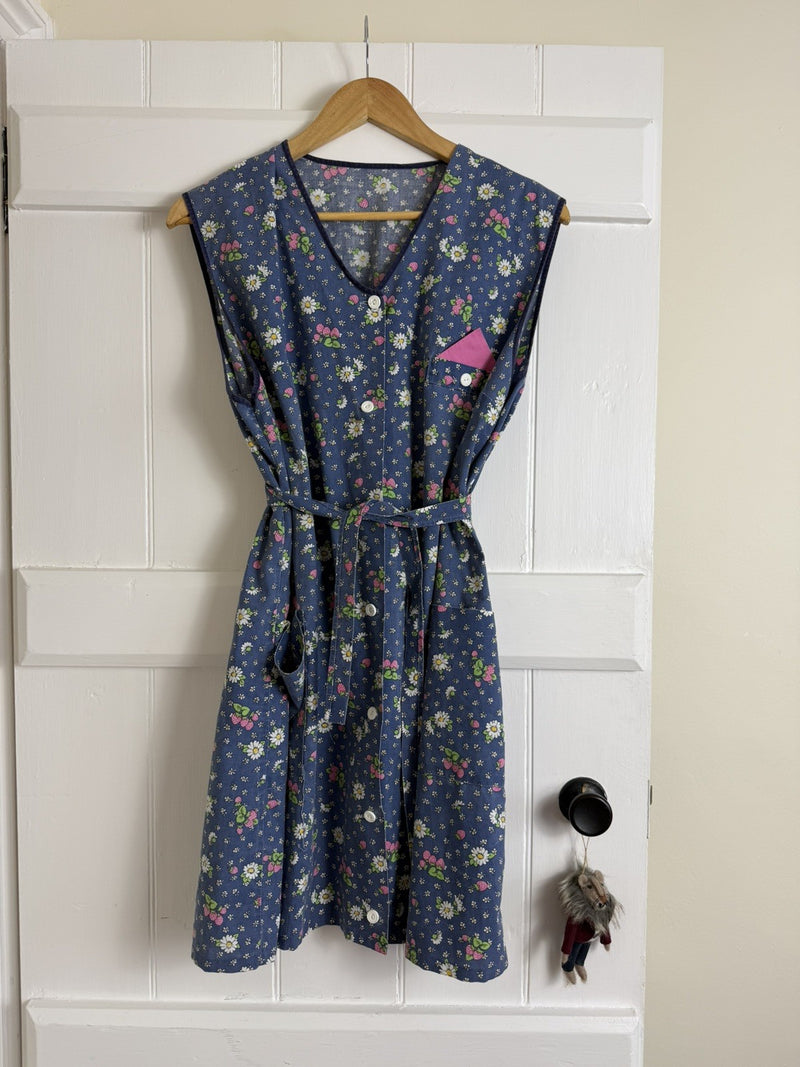 Vintage 70s Size XL 14-18 Blue Strawberry Floral Cotton Apron Dress