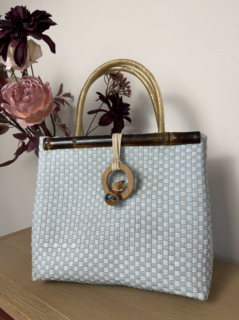 Vintage 1950s Blue Woven Top Handled Basket Handbag Bag