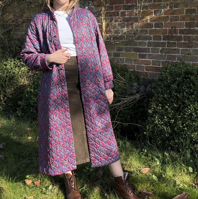 Vintage 70s Size L 12-16 Purple Quilted Paisley Long Bed Jacket