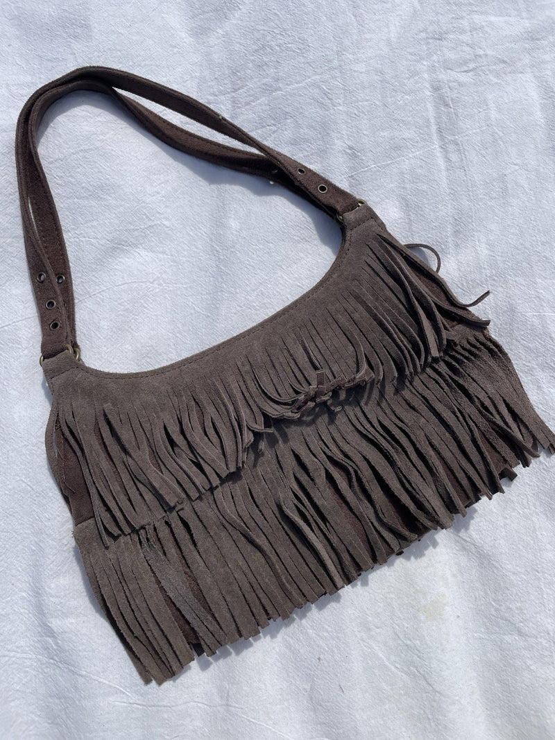 Vintage Y2K Brown Fringed Suedette Handbag Shoulder Bag
