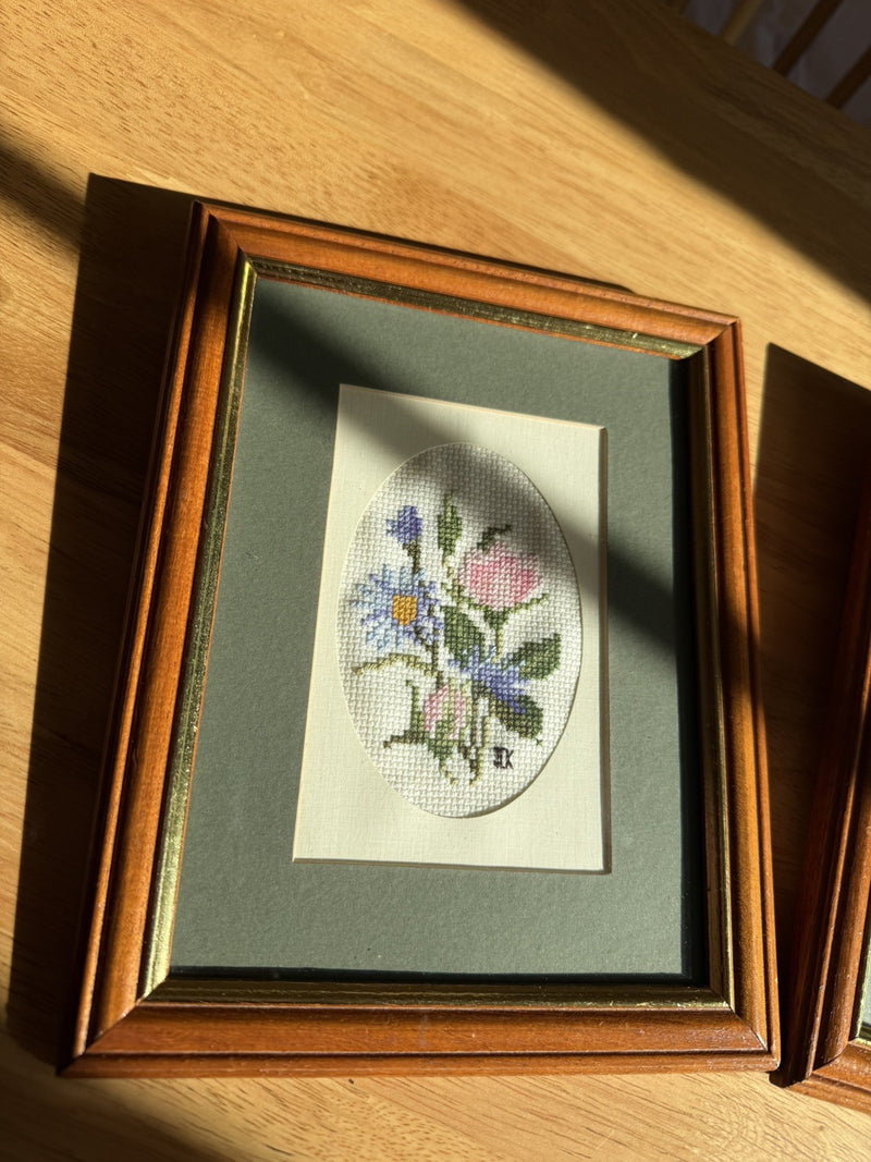 Vintage Pair of Framed Floral Cross Stitch Art Work