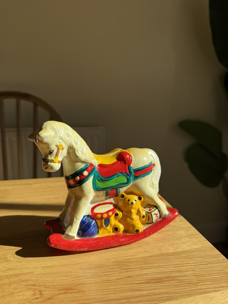 Vintage 1980s Handpainted Ceramic Rocking Horse Piggy Money Bank