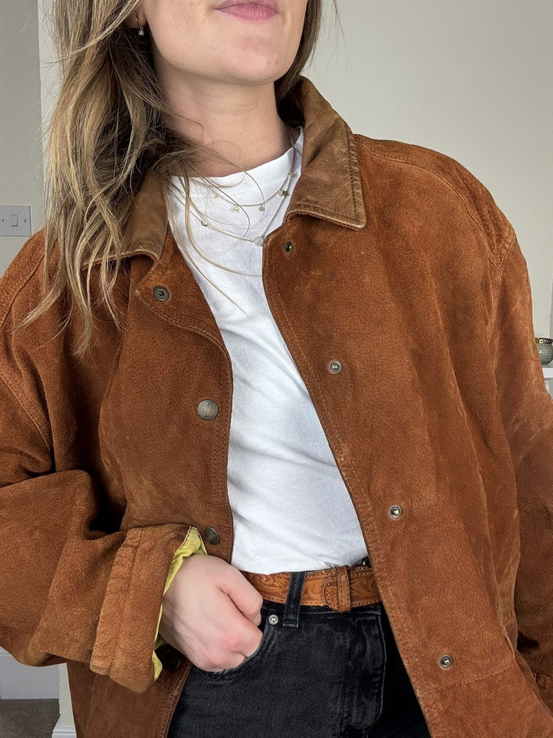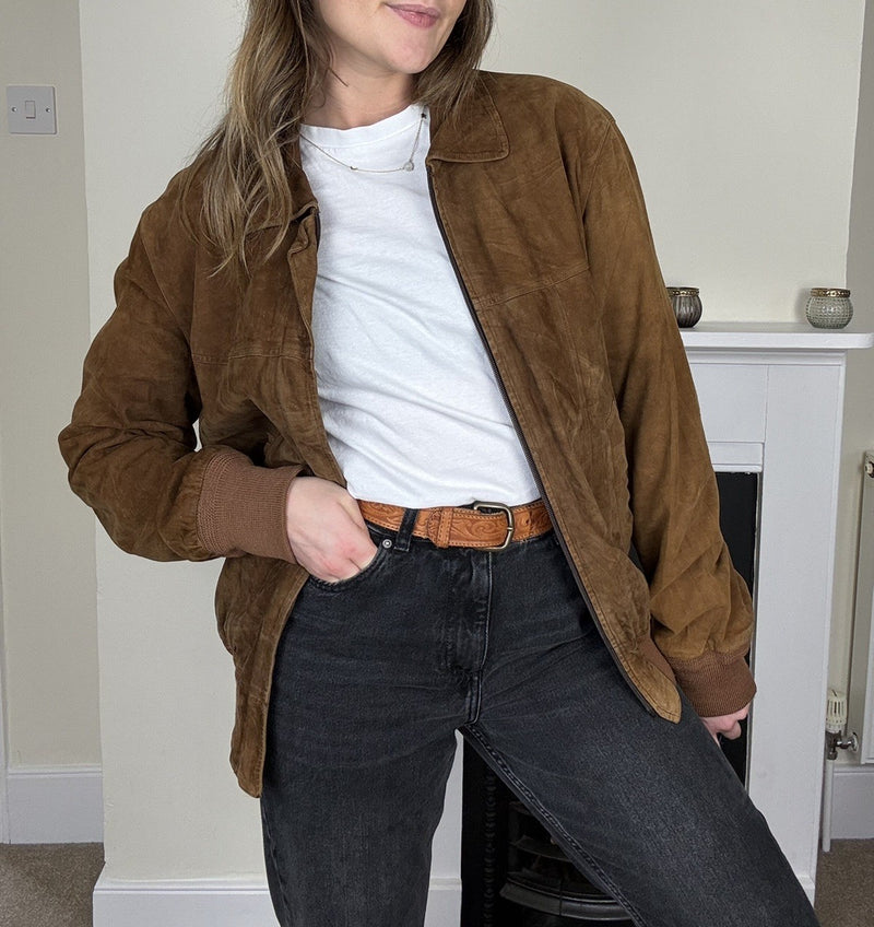 Vintage Size L 8-14 Brown Genuine Suede Leather Bomber Style Jacket