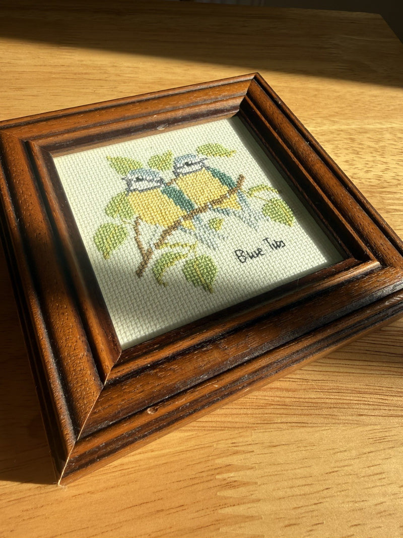 Vintage Small Square Framed Blue Tits Bird Cross Stitch Artwork