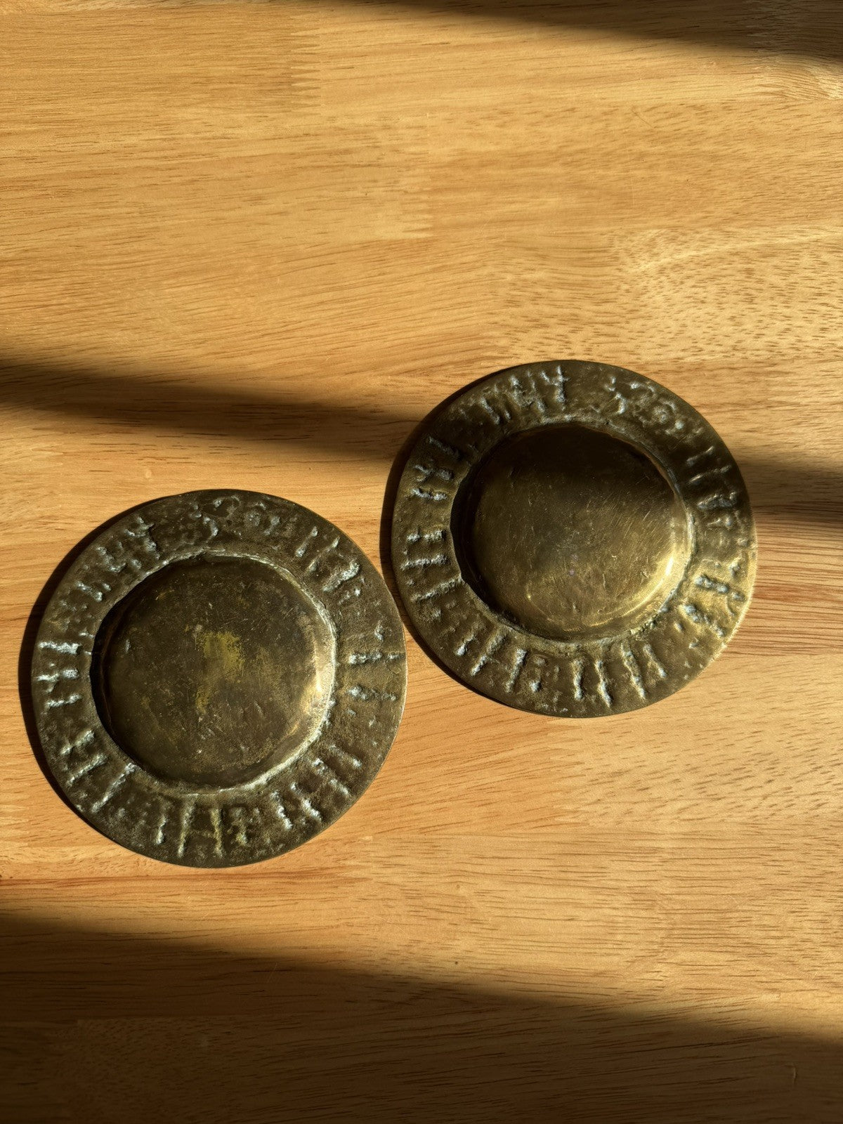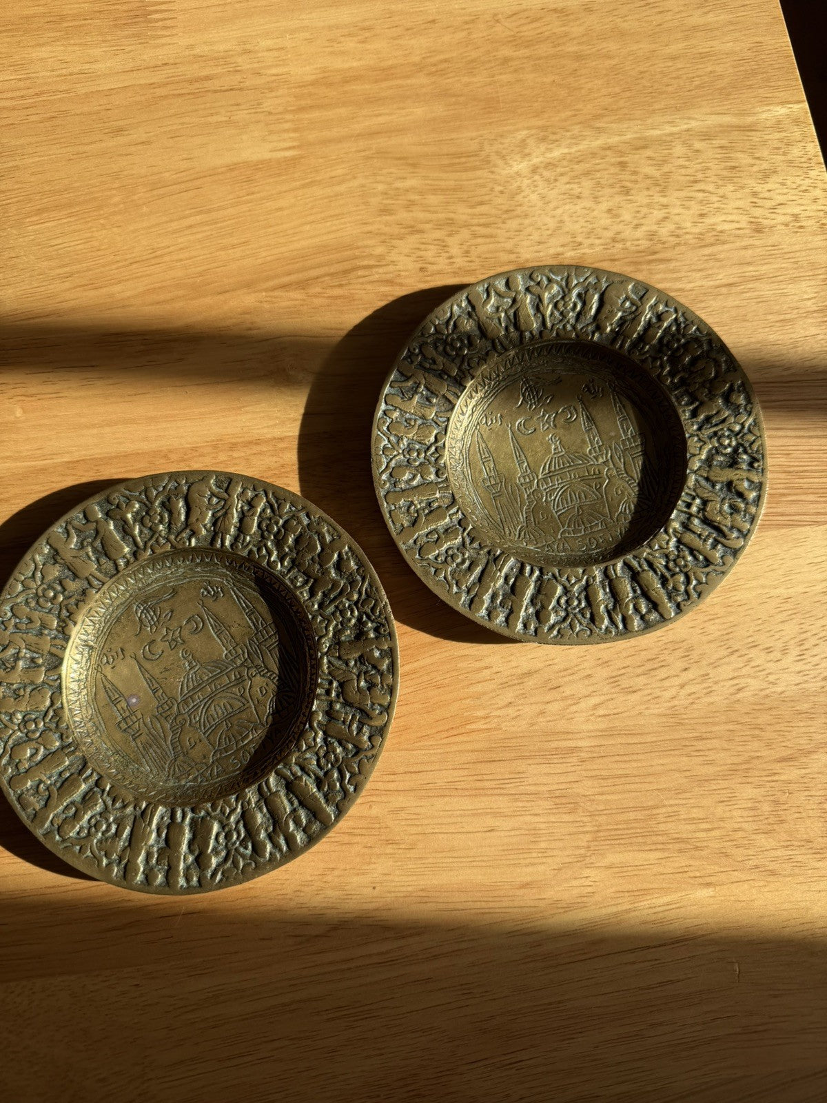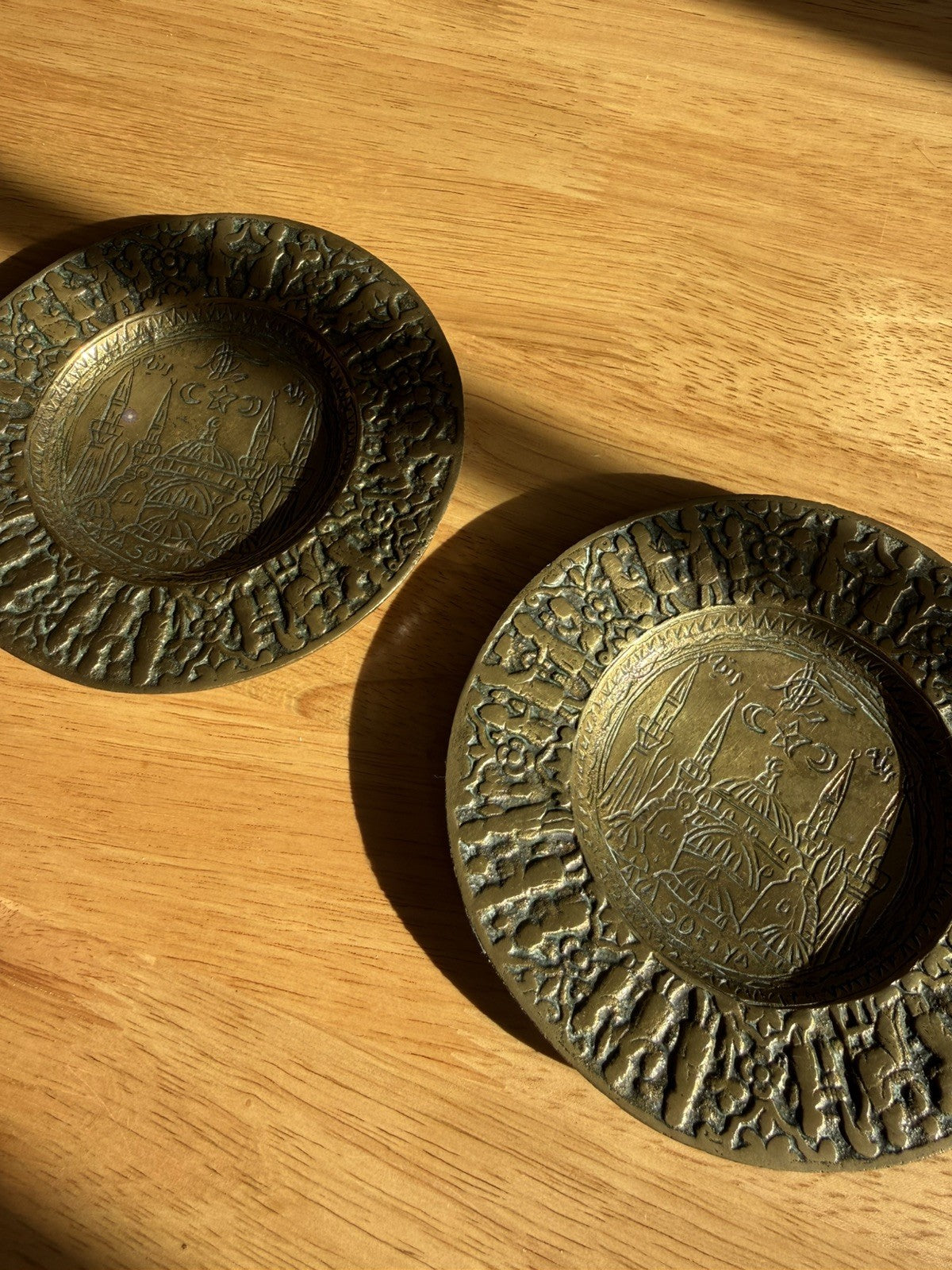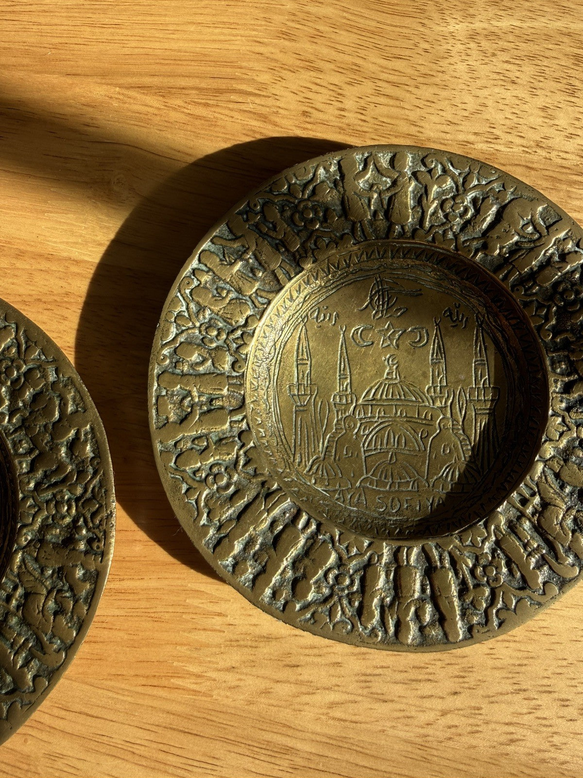 Gorgeous pair of vintage brass patterned Aya Sofiya plates/dishes. Gorgeous handcrafted details and perfectly aged brass. Perfect as trinket dishes or to place candles on!