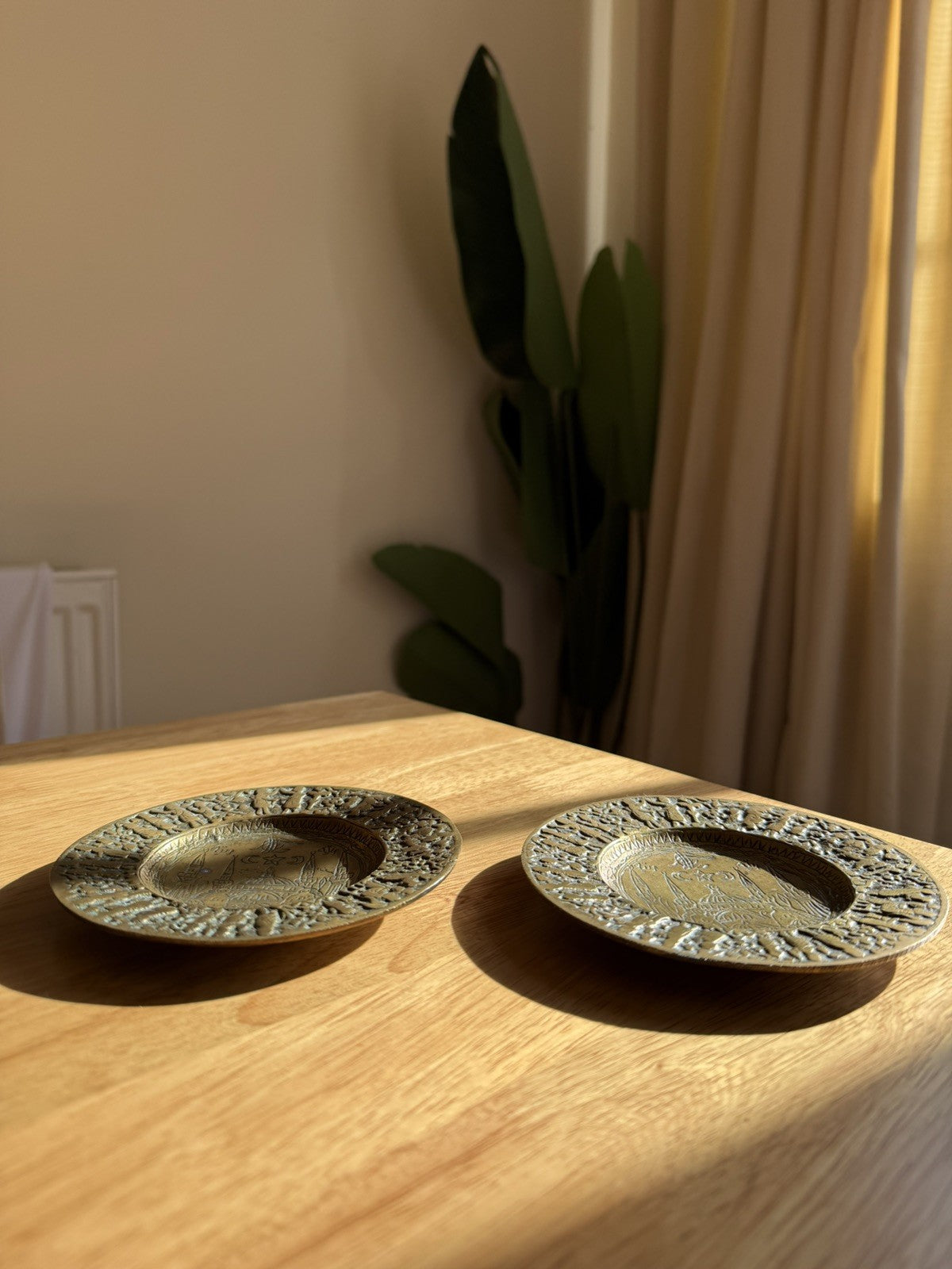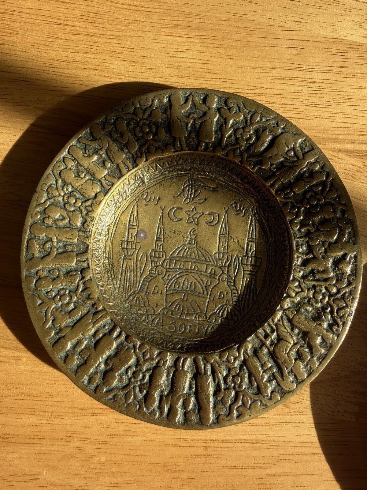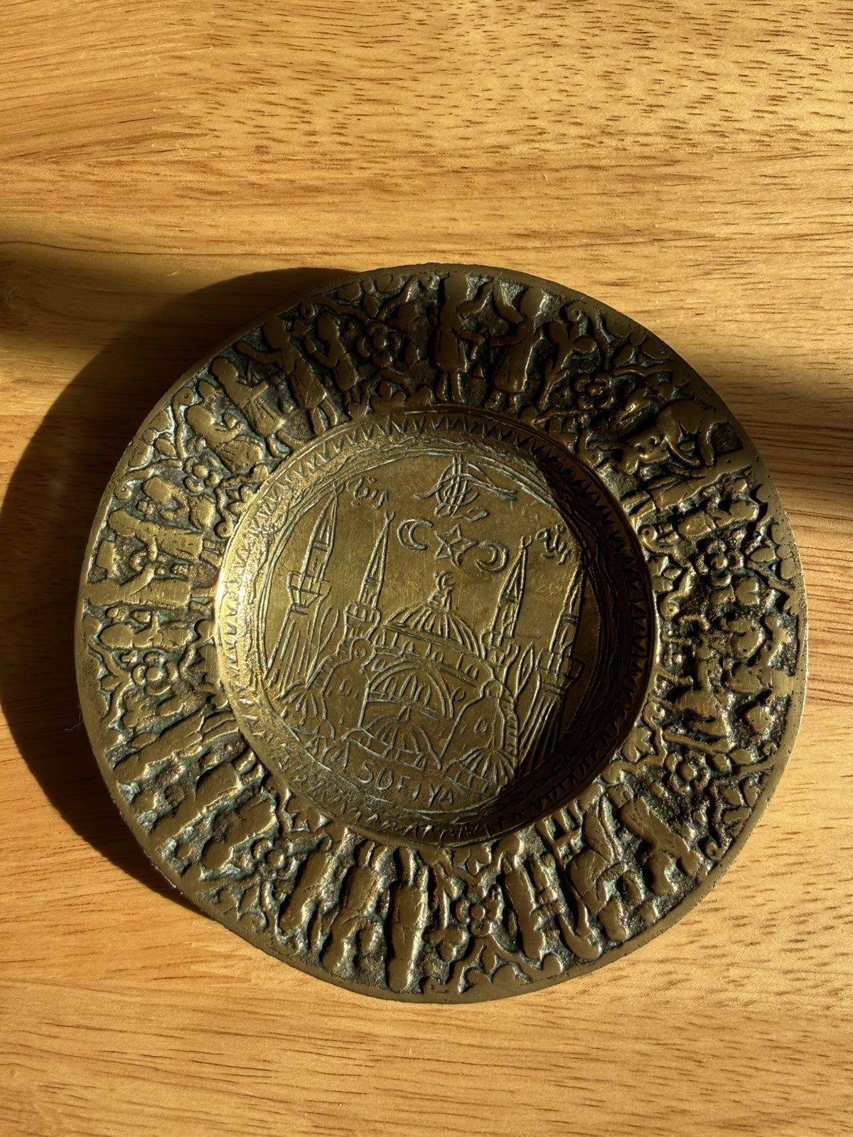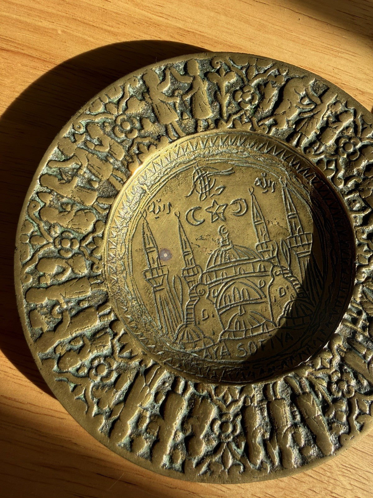 Gorgeous pair of vintage brass patterned Aya Sofiya plates/dishes. Gorgeous handcrafted details and perfectly aged brass. Perfect as trinket dishes or to place candles on!