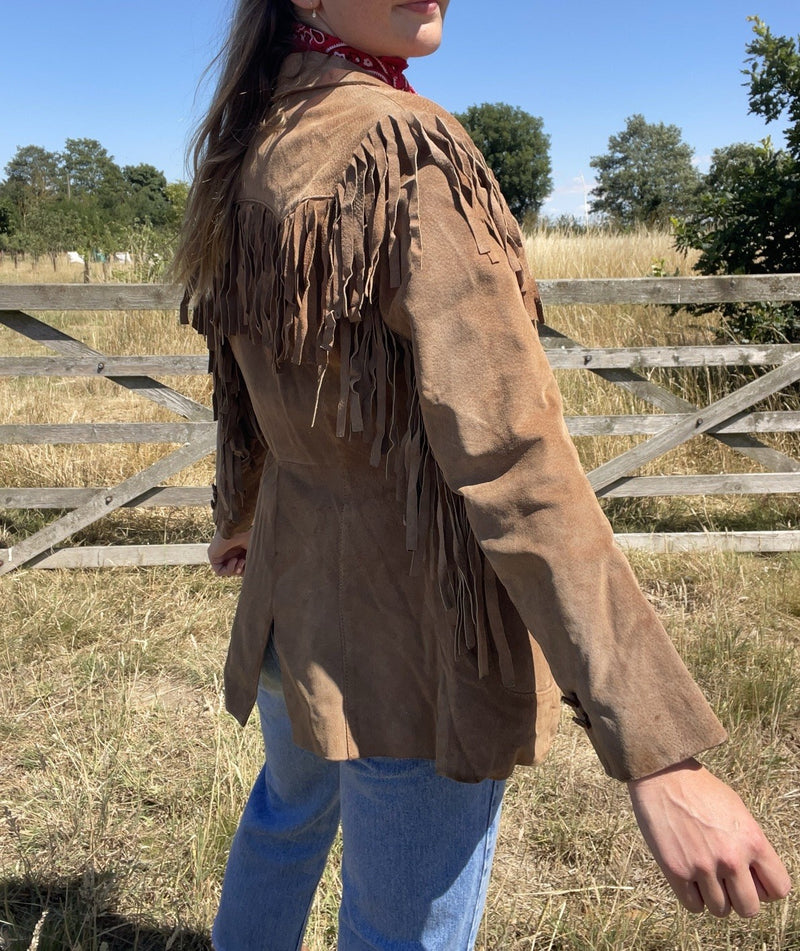 Vintage Size S 6-10 Tan Brown Western Fringed Suede Leather Jacket Jet Set