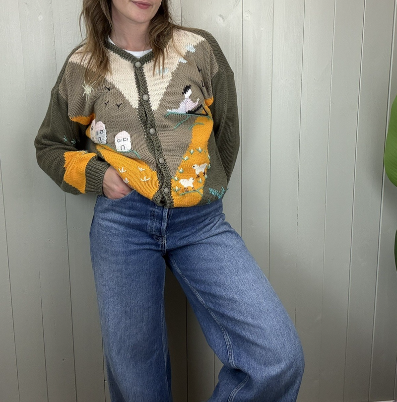Vintage Size L 10-14 Taupe Country Sheep Pure Cotton Knit Cardigan Bella
