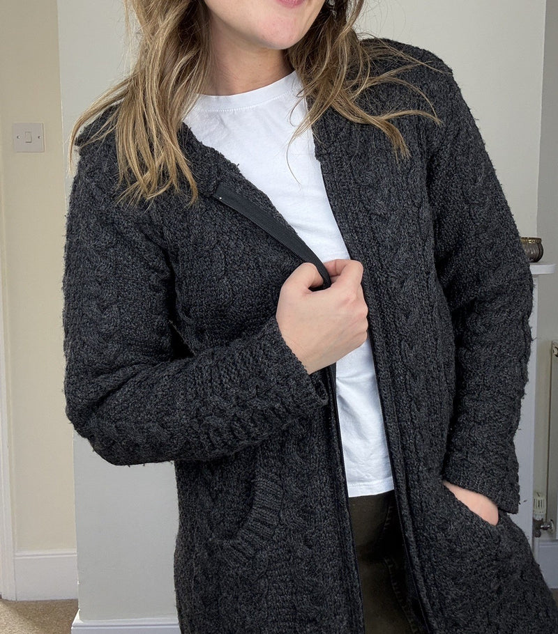 Size S 6-12 Dark Grey Merino Wool Chunky Knit Aran Hooded Cardigan Aran Crafts