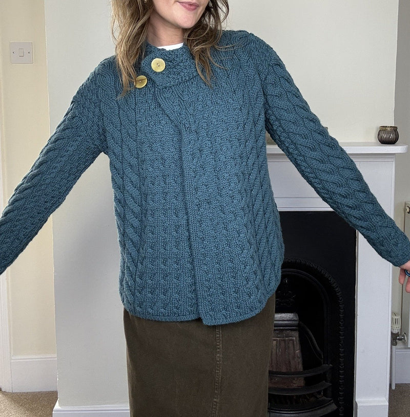 Size S 6-12 Teal Blue 100% Merino Wool Irish Aran Knit Cardigan