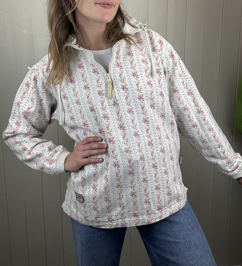Vintage Size M 8-12 White Cottage Floral Cotton Half Zip Jumper Deal