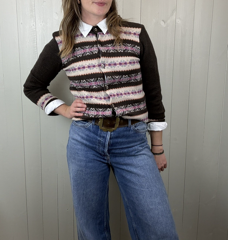 Vintage Size XS 6-8/10 Brown 100% Wool Patterned Fine Knit Cardigan Toast
