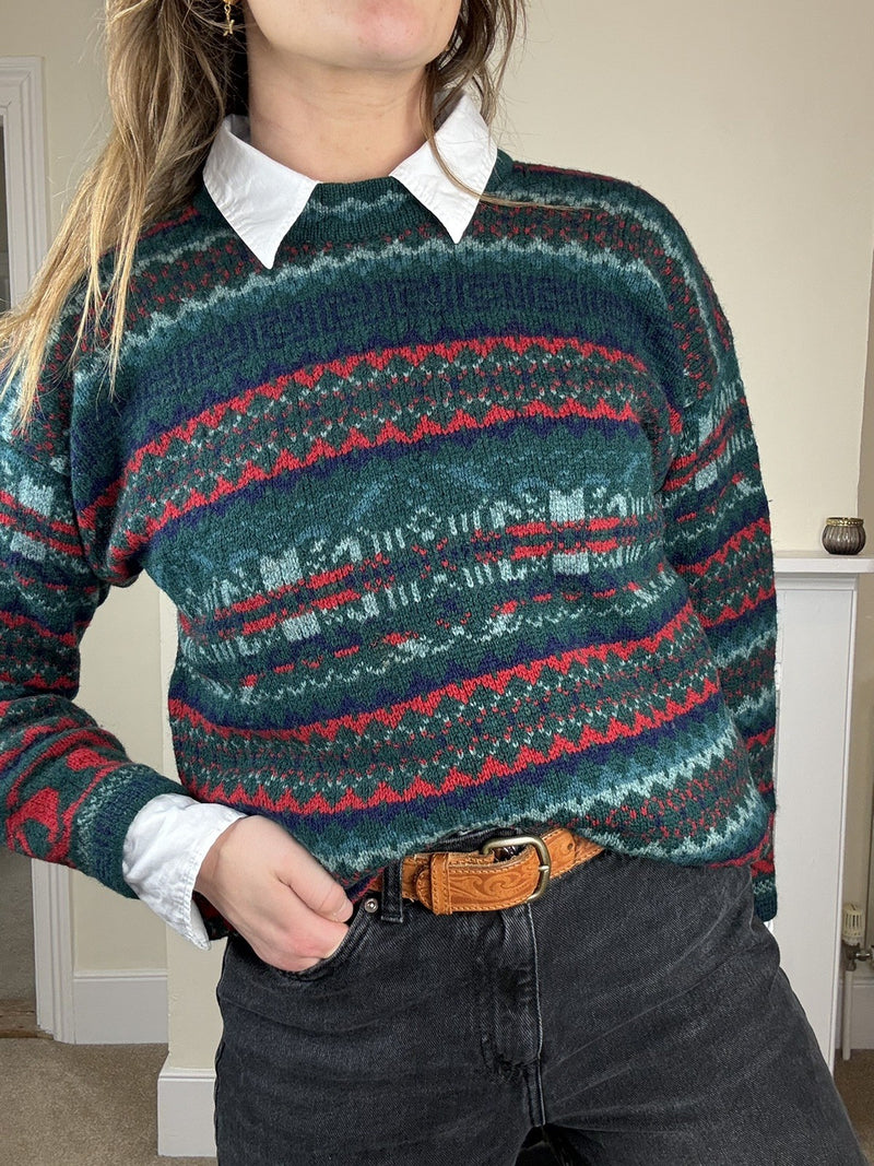 Vintage Size M 8-12 Green Patterned Pure Lambswool Knit Jumper Edinburgh