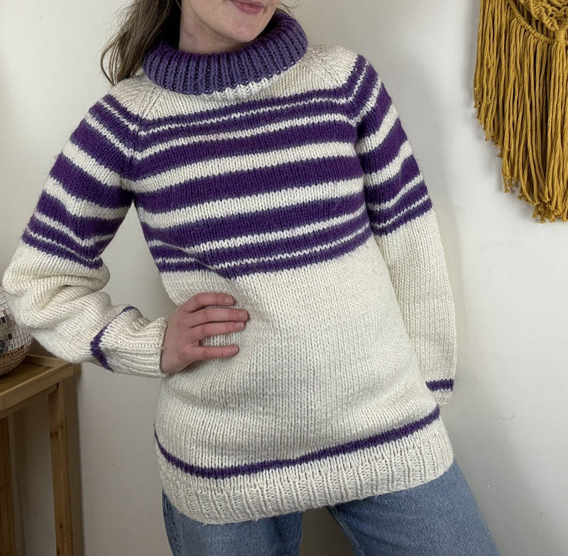 Vintage Size S 6-10 White Purple Handmade Striped Knit Roll Neck Jumper