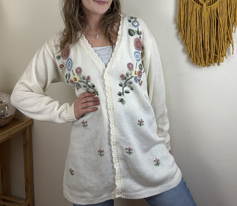 Vintage Size XL 12-16 White Flower Embroidered Scalloped Knit Cardigan