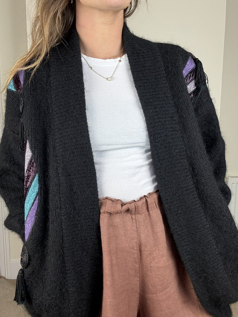 Vintage Size M 8-12 Black Mohair Blend Applique Chunky Knit Cardigan Excel