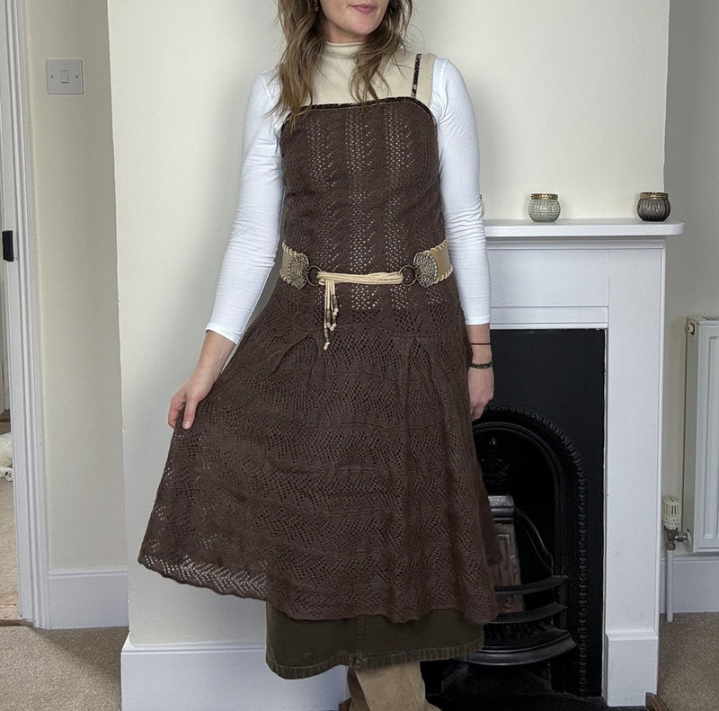 Vintage Size S 8-10 Brown Pointelle Knit Dropped Waist Mohair Blend Midi Dress