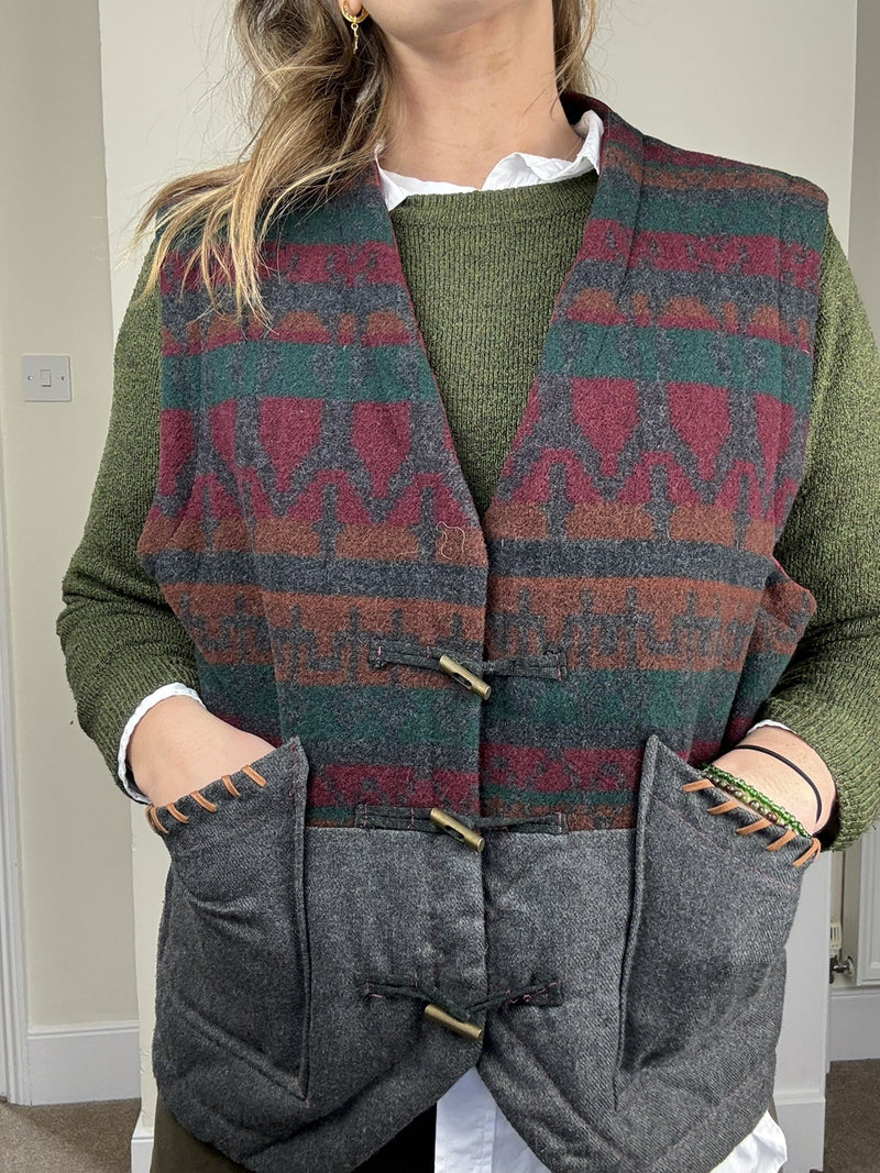 Vintage Size XL 14-16 Boho Wool Patterned Quilted Waistcoat Gilet Shirt Mocoa