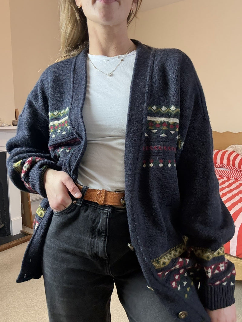 Vintage One Size 8-14 Dark Grey Navy Slouchy Boho Western Grandad Knit Cardigan