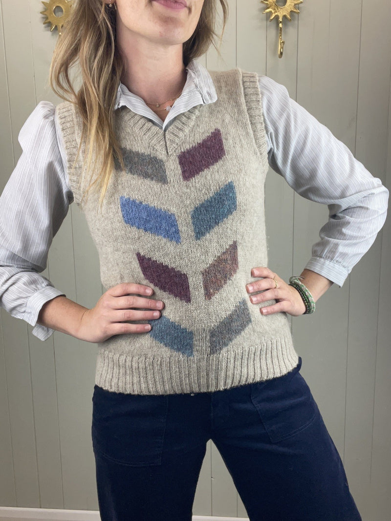 Vintage Size 2XL 16-20 Grey Patterned Pure Wool Open Front Knit Vest Blainroe