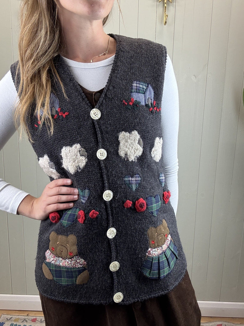 Vintage Size L 10-14 Dark Grey Cottage Sheep Teddy Patterned Knit Vest Waistcoat