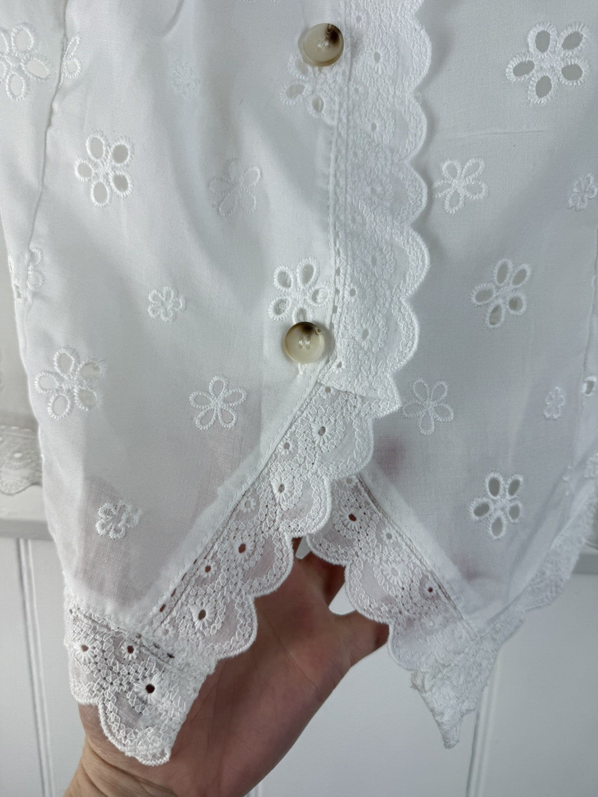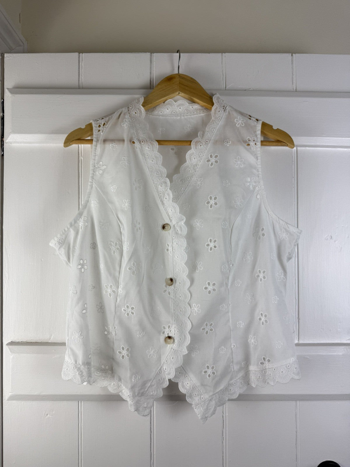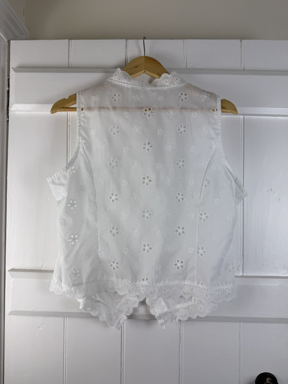 Super lovely white broderie scalloped blouse. Super sweet! Gorgeous scalloped trim and broderie fabric. Perfect on it's own or layered as a waistcoat. Label has been cut out but looks like a 'made in italy' label.