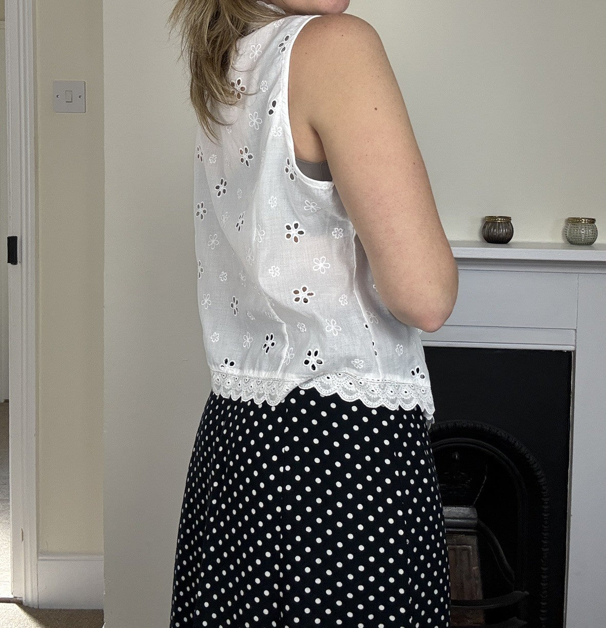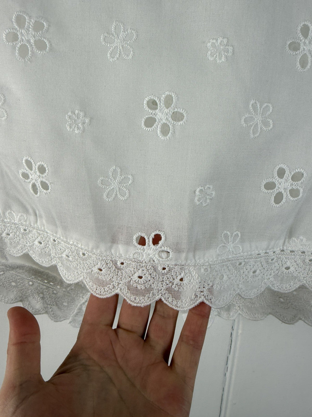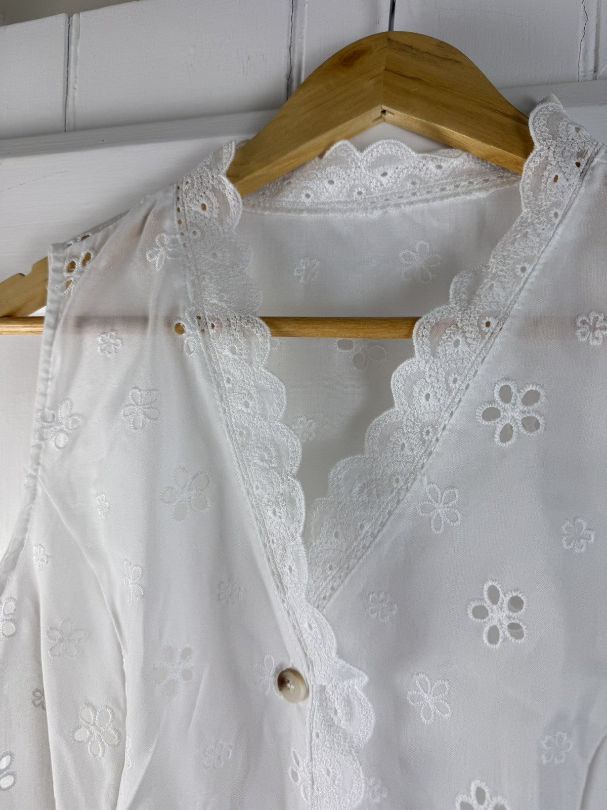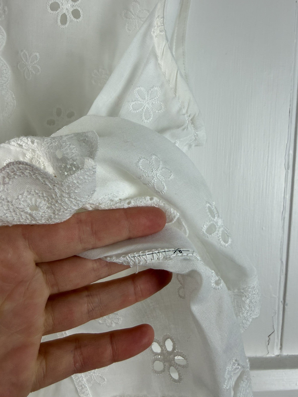 Super lovely white broderie scalloped blouse. Super sweet! Gorgeous scalloped trim and broderie fabric. Perfect on it's own or layered as a waistcoat. Label has been cut out but looks like a 'made in italy' label.