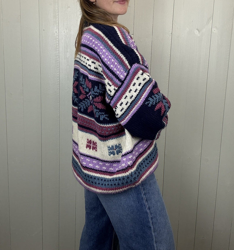 Vintage Size 2XL 16-20 Purple Patterned Chunky Knit Handknit Jumper