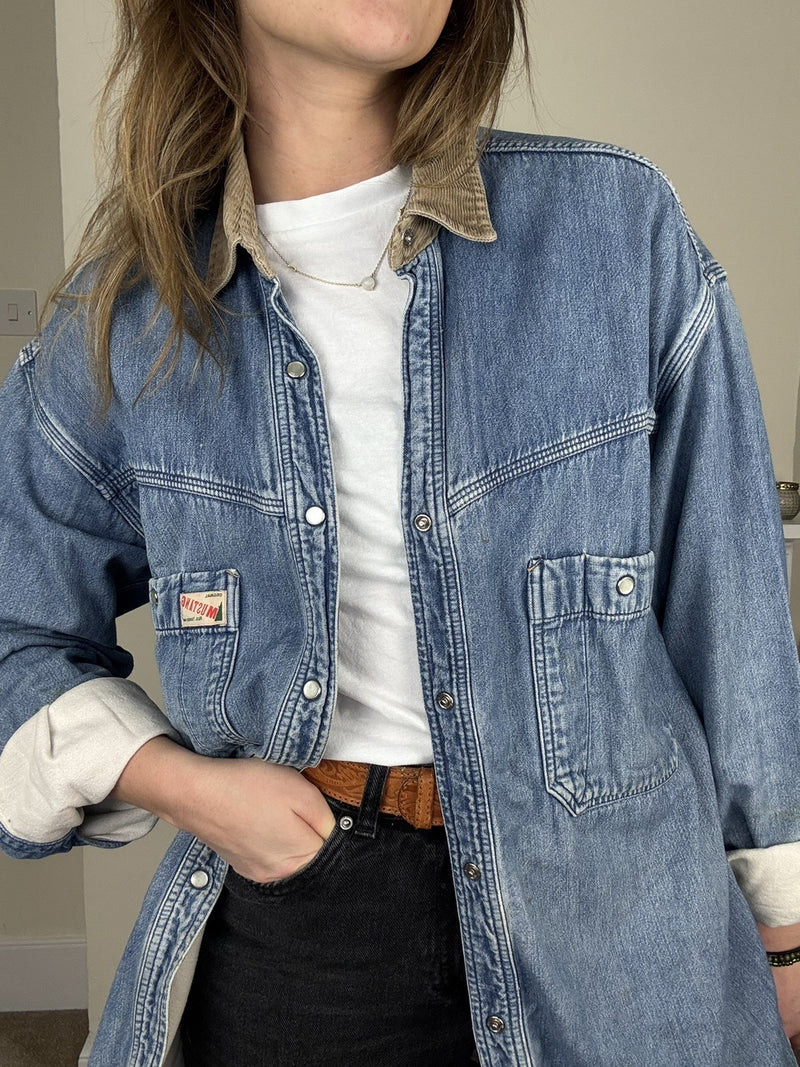 Vintage Size L 8-16 Blue Denim Western Worker Shirt Mustang
